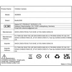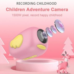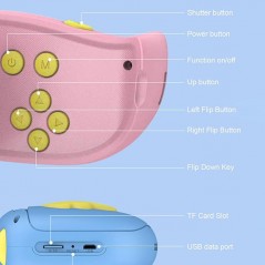 Caméra numérique Bodhi-2000 pour enfants, écran LCD couleur, capteur HD photo/vidéo, double objectif avant/arrière, fonctions jeux intégrés, support carte microSD pour stockage, batterie rechargeable intégrée via USB, design robuste et sécurisé, adaptée aux enfants.