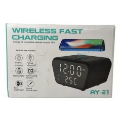 Réveil avec charge sans fil rapide, puissance de charge 10W/15W compatible Qi, affichage LED numérique avec fonction horloge et alarme, intégration thermomètre pour affichage de la température ambiante, port USB supplémentaire, design compact et moderne, alimentation via câble USB.