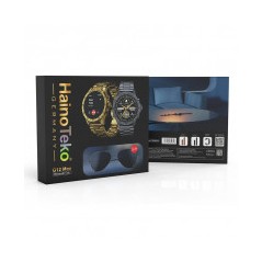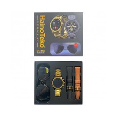 Pack Montre connectée Haino Teko G12 Max, écrans tactiles couleur HD, connectivité Bluetooth, compatibilité iOS/Android, suivi fréquence cardiaque, sommeil, activité sportive, notifications appels, messages, réseaux sociaux, multiples modes sportifs, autonomie plusieurs jours, bracelets Gold & Noir interchangeables, design élégant et moderne.
